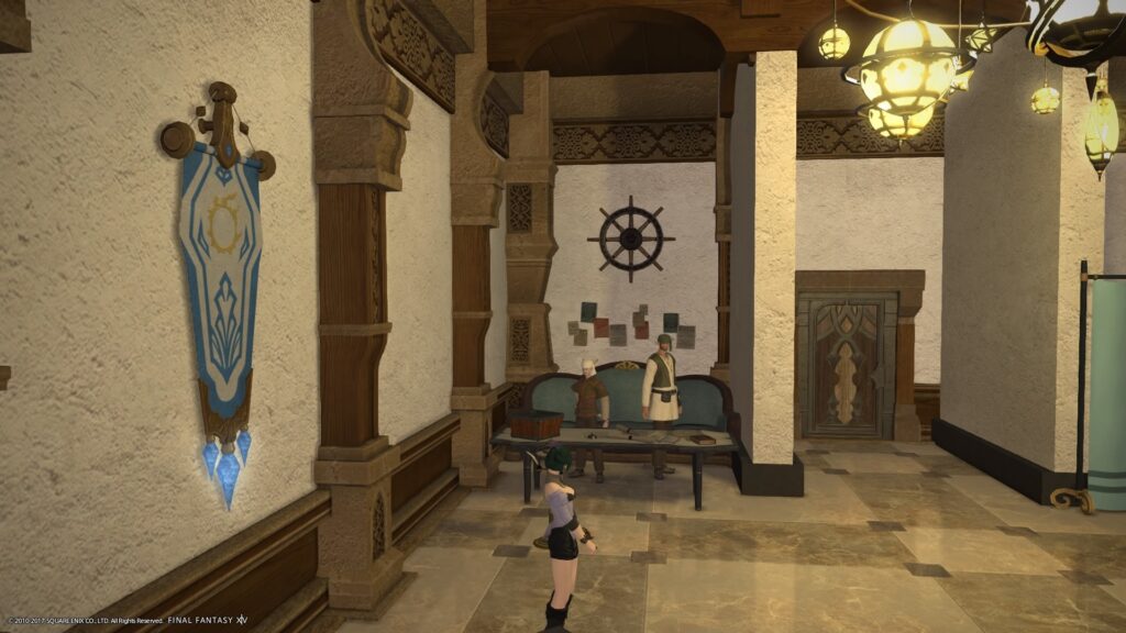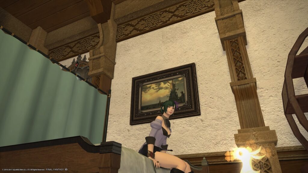 そして左側に、カンパニーチェストや愛蔵品チェスト、それからオーケストリオンに紀行録を置いてます。ごちゃごちゃしてるところは隠したいから、セラピーカーテンを使いました。で、久しぶりに盟友の肖像画と探偵と助手の肖像画を飾ってみたり。お友達よ、あたい、またもや旅立つんだぜ……。暑くてたまらん時にはまた、イシュガルドに行って仲良し主従を眺めてくるから安心しなっせ。