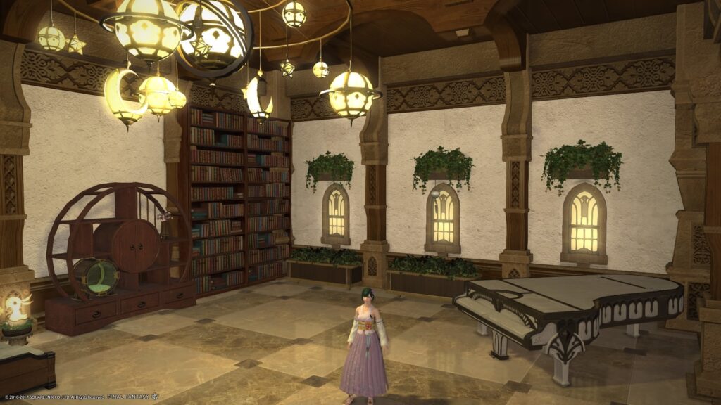 とにかくそんな次第ですから、視覚的な涼しさが恋しいわけです。さらに、少し前に導入された白壁を試してみたくねえ。ウルダハハウジングエリアの市場で販売されてるというから、壁と床、それからパーティションを購入して、ぐるりと変えたのでした。うん、温かみのある部屋よりも倒れ込んだらひんやり涼しい部屋になって欲しかった。