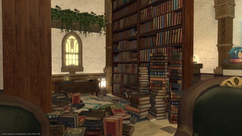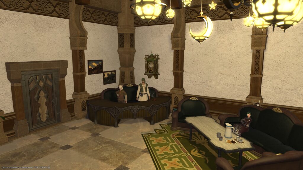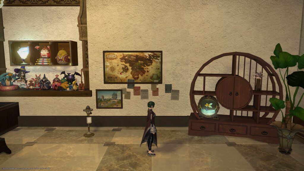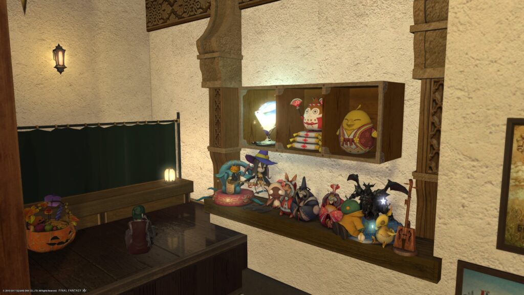 そのまま、奥に視線をずらすと、寝室エリアです。ダブルフェザーベッドに、ザナラーンストール。そして、ここでも鉢植えを置いています。いや、ふたつ目の鉢植えを置ける事実にびっくりしました。でも確か、鉢植えは育ちきってもそのまま飾って置けるようになったんですよね? だから増えたのかも〜と思いつつ、とりあえず、大好きな桜を植えてみました。ピンクになってほしいなあ、という願いをかけております。あと、足元にチョコボランプを飾ってますね〜。かわいいから癒される。癒されるものは、寝室に置きたいのです!