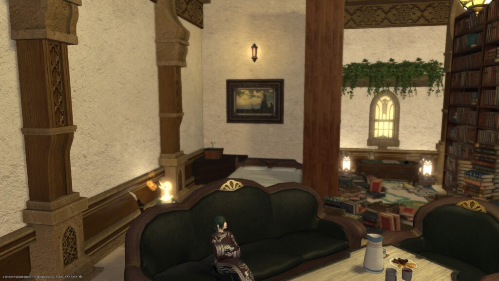 それから、真ん中の窓だけ残して、あとは、ホワイトパーティションで窓を埋めました。ウォールライトで左右の光源としてます。どちらも、ハウジングエリアでNPCから購入できるアイテムですね。左から、寝室、書斎、だらだらスペース、という区分けです。