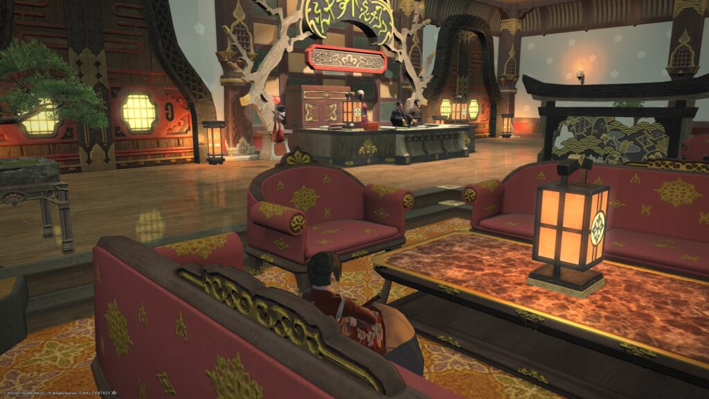 やっぱり、竜宮城みたいだなあ、綺麗だなあ。建物の好みは、どちらかというとグリダニアなんです。緑好きだし、木造好きだし。だがしかし、シロガネ建築は和風が映えるから、やっぱり好きだ。商店街あたりも、温泉地の商店街みたいだし、京都とかの、ぎゅっと凝縮された街も好きなんです。