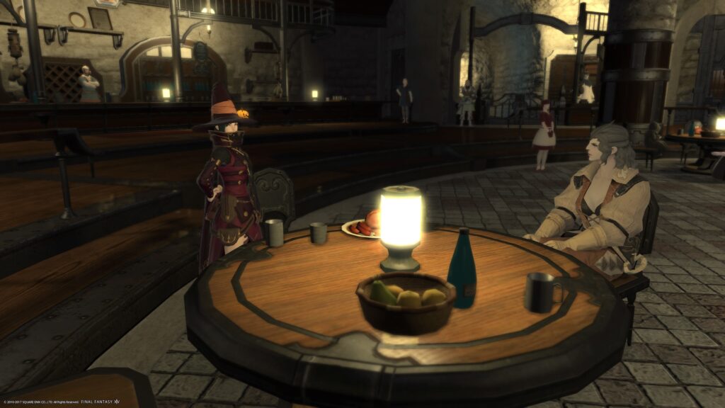 ……お祭りで浮かれ気分のまま、顔見知りが注文した料理をそっとつまみ食いしようとして見咎められた図、みたいになったなあと感じたのですよ。軍票で交換できる、新しいエモートの「休め」を使った図です。他にグループポーズの機能をあれこれいじったかな〜。