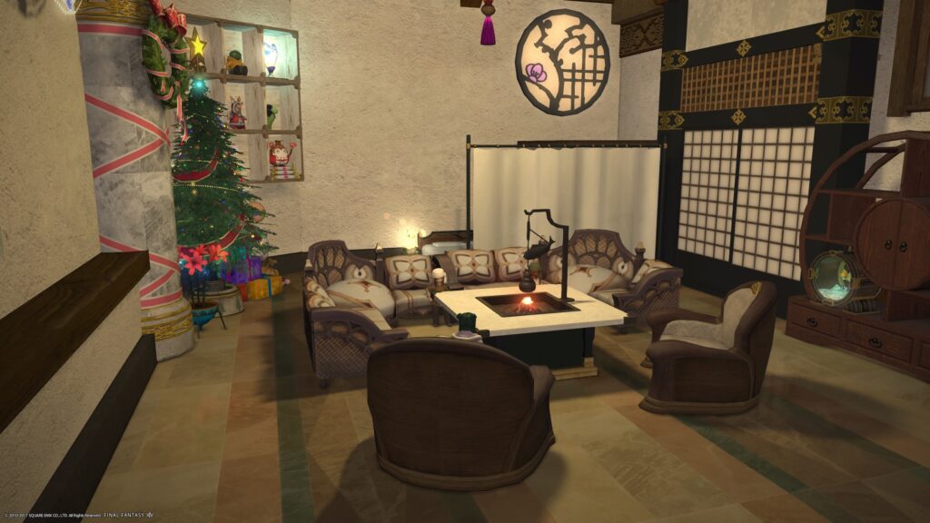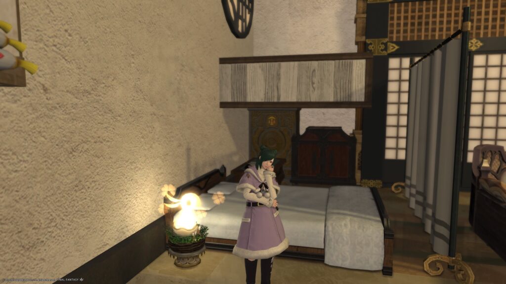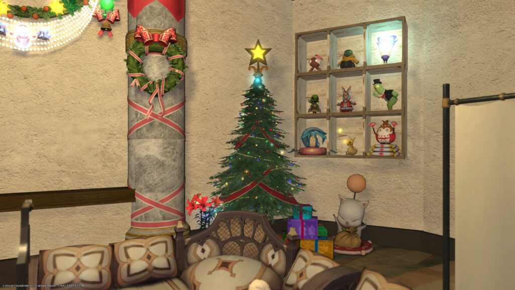 他に、染色できる家具をどんどん、白く染めて行ったら、なんだかますますクリスマスっぽく、なってくれたのではないかなあ、という期待があります。あ、床材はね、NPCのお店で販売しているものですよ。いや〜、楽できるようになりましたね!