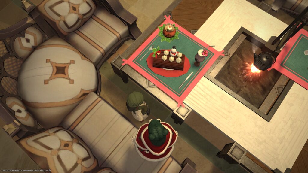 我が家には、白銀囲炉裏がありました。ただ、この料理を置こうとしたら、明らかにはみ出てクロスが燃えなければおかしい感じだったので、ザナラーンダイニングテーブルをくっつけて、無理やりのせました。机部分がちょっと大きくなったから、ソファセットなどをつつつと移動させて、素材屋さんたちの前に、ごちそうをおいてみたり。ええと、うん、ごちそうだから!!
