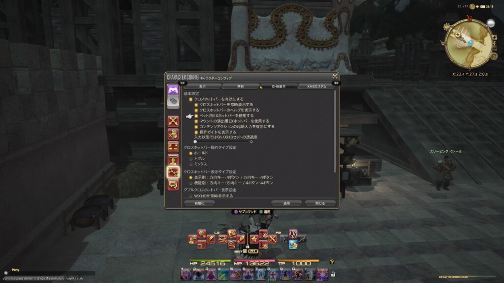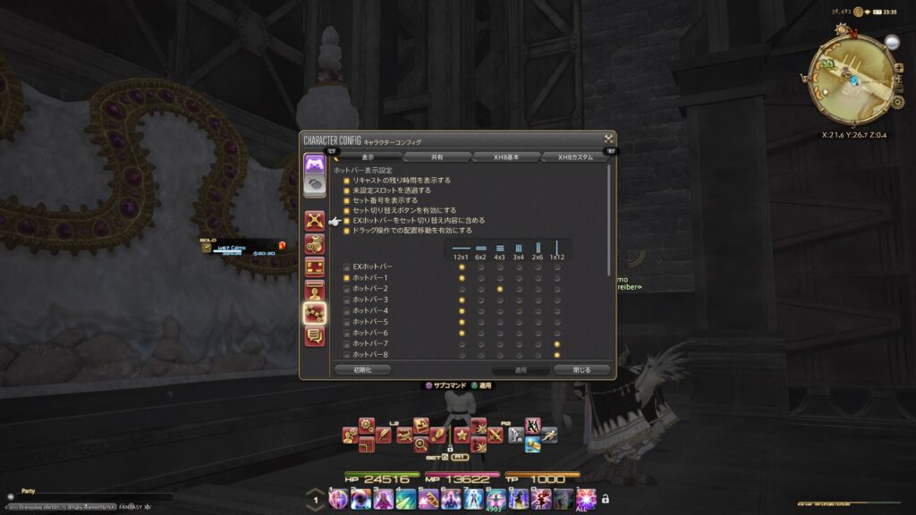 これが、わたしのクロスホットバーの設定です。おそらく、この部分にチェックしているから、クロスホットバーが自動的にEXホットバーに切り替わるんだと思います。それがなぜ、通常のクロスホットバーに切り替わったのかといえば、それは多分、R1かR2を押して、切り替えてしまったからだと思います。ではなぜ、その切り替えを続けることによって、EXホットバーが戻らなかったのか?