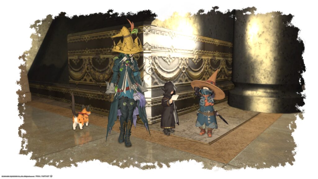 現在、白く染めたハイハウス・バッスルドレスを中心としたミラプリにしておりますから、黒魔道士、というには、ちょっとビミョーな装備になってるかもしれません。でもなかなかお気に入りだから、るんるんとジョブクエストのカットシーンを眺めていたのですけれども、ちょっとヒヤリとしておりました。