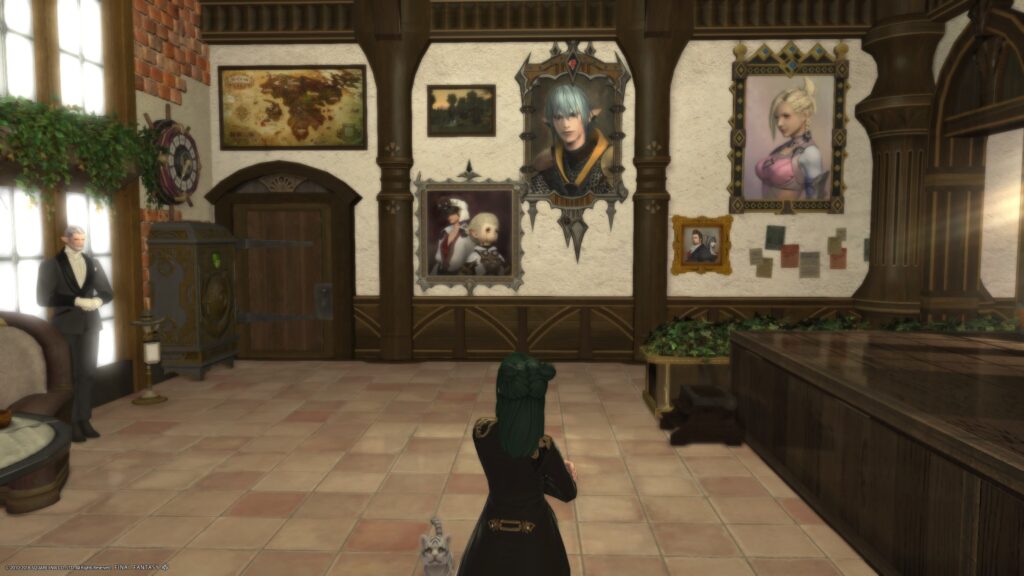 だから他の仲間たちの肖像画も飾りました。選抜メンバーの理由は、最新パッチまでメインクエストを進めたみなさまなら明快でしょう。や、一部、手持ちにあったから、という理由で飾ってる肖像画もありますけれど。飾ってみて、なんか嬉しいです。正直なところをいうとね、昨年のカレンダーにあった、暁のメンバーが揃ってる、あのイラストを飾りたいなあという気持ちもあったのですけれど、とりあえずはこれでいいのさ!
