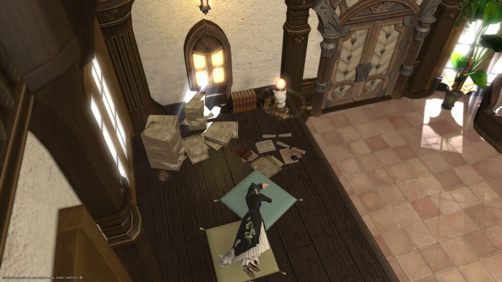 すると、今日、掘り出し物の中に、ハウジングアイテムが混じっていました。実はうちの秘書さんたち、ハウジングアイテムの持ち帰り回数が多い、気がしてます。今日はザナラーン形式の屋根。あ、以前にもチョコボの植え込みを持ち帰ってくれた、と書きましたが、あの後、モーグリ植え込みを持ってきて帰ってくれたし、……そうそう、Sサイズのもぐもぐハウスも持って帰ってくれました。