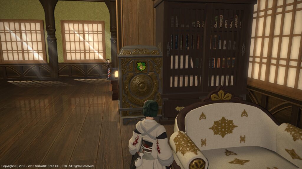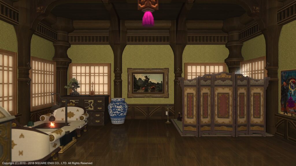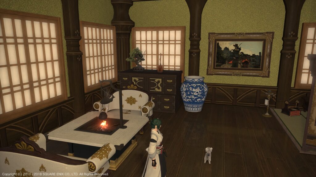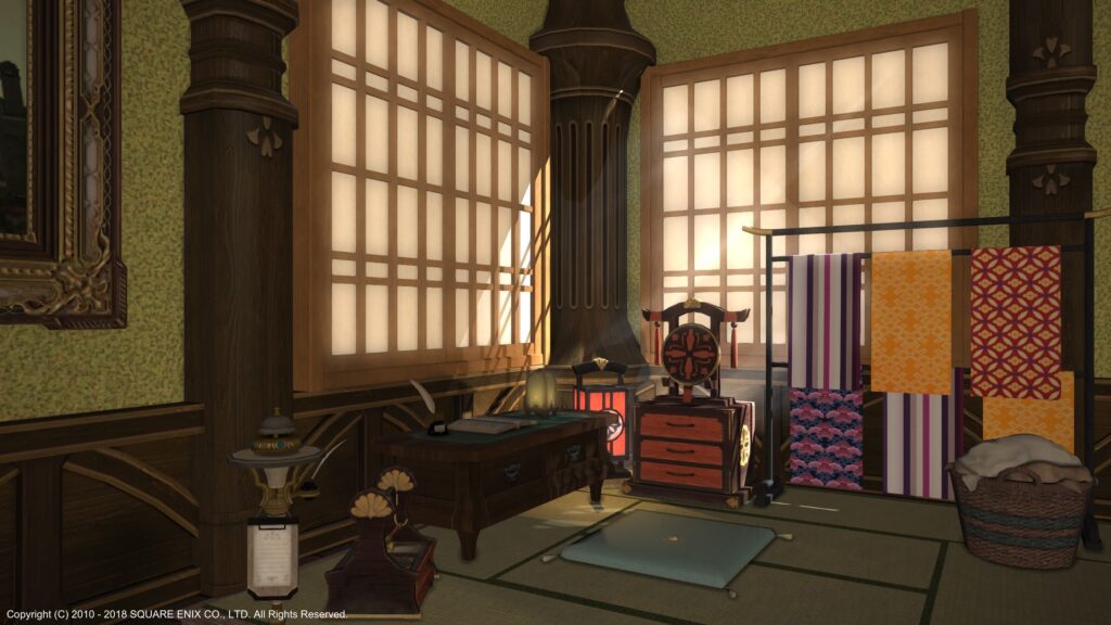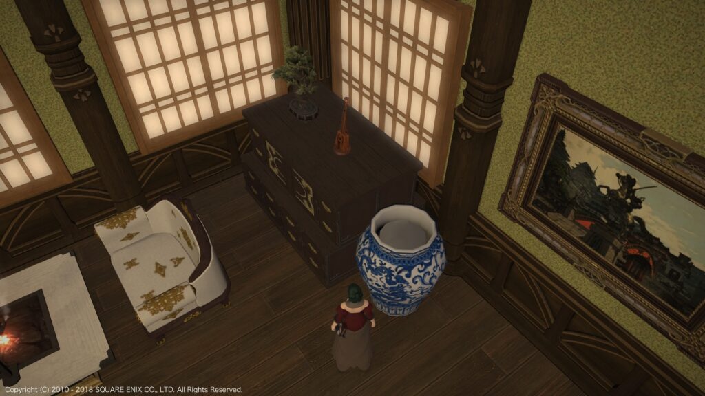 絵画の隣、ドマ風衝立で隠れている部分です。とても置きたかった家具は、紀行録です。ですがもちろん、東方の化粧箱たちも使いたかったのですよね。だからここは、日記(?)を書きながら、身支度もしているスペース、みたいな感じで。そばにある洗濯カゴは洋風な家具ですけれど、洗い物はたぶん、世界共通だから! それからキセル箱も置いてみたり。うちの冒険者はどんなに頑張っても、色っぽい感じにキセルを吸えないタイプですけれどね、憧れはあるんだよ、ええじゃないかええじゃないか。