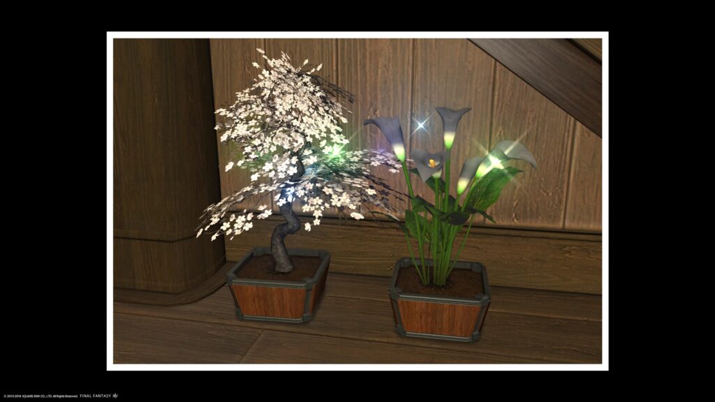そういえばシュラウドチェリーのピンクも欲しかったんだわ、と思い出して、シュラウドチェリーとカラーを並べて育てたんです。それから、畑理論がこちらにも適用されます。つまり、倉庫に収納したら時間が止まってくれます。だから、ずっと見張って肥料をあげられないかたは、倉庫にしまいつつお試ししたら良いのではないかな〜と思います。地球時間で2時間くらい? そのくらいの頻度で肥料をあげられるようになりますから、2時間以上エオインしていられるときに、倉庫から出して肥料をあげてみる、とか。