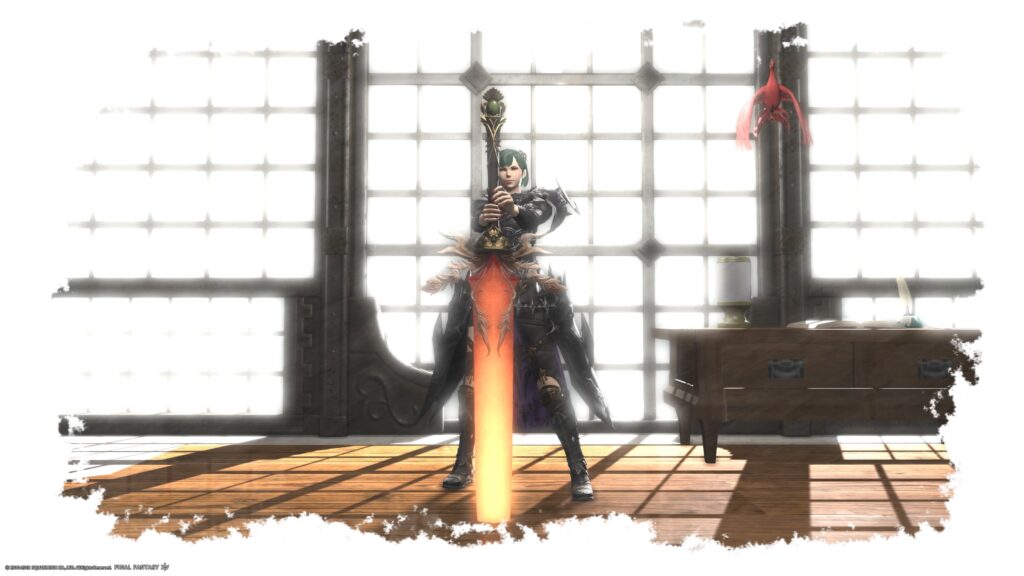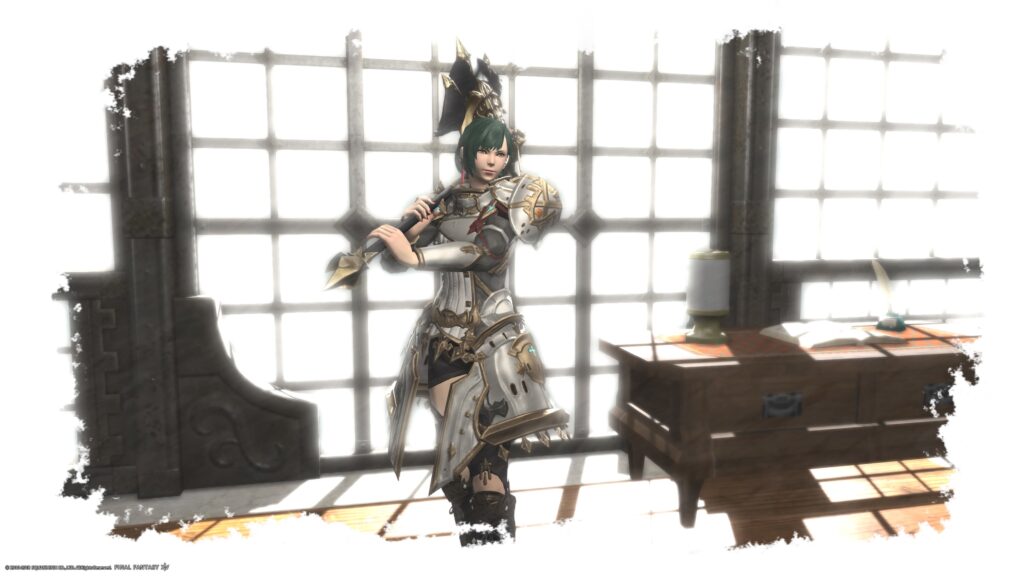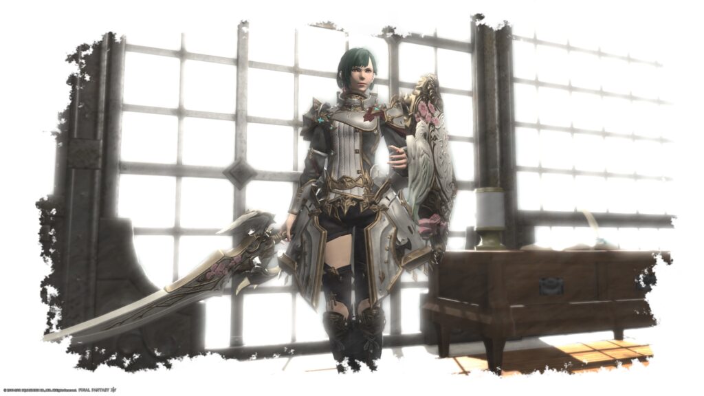 あ、脚装備にはアラミガンディフェンダー・ボトムを、足装備にはLV式長靴をミラプリしてます。どちらもお気に入りのミラプリ装備です。ちゃんと鎧を引き立ててくれる組み合わせになってくれるんだもの。嬉しい!