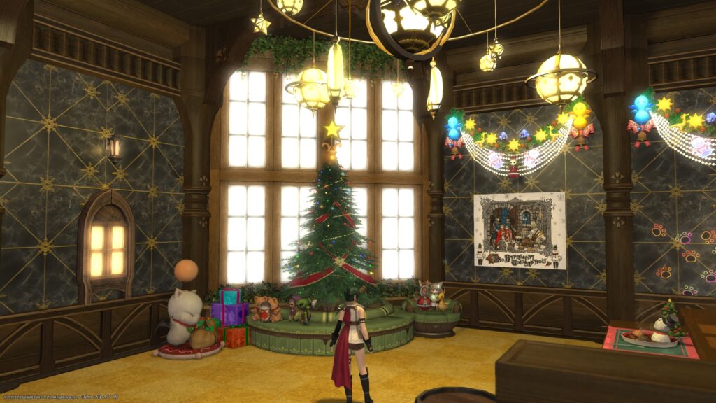 太陽の光が入ると、こんな感じになります。先のハロウィンイベントの報酬もちょいと飾りました。とてもかわいいから、ちょいと飾ってもいいかなあと思いまして。下への階段の踊り場には、ポスターも飾ってみました。ハロウィンからクリスマスになったよ、という感じですかね〜!(適当)