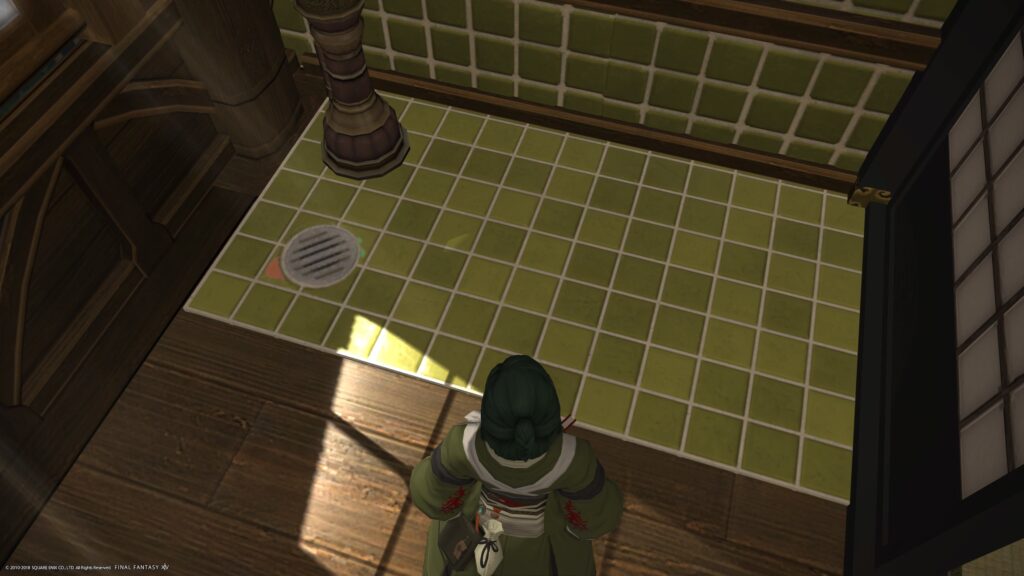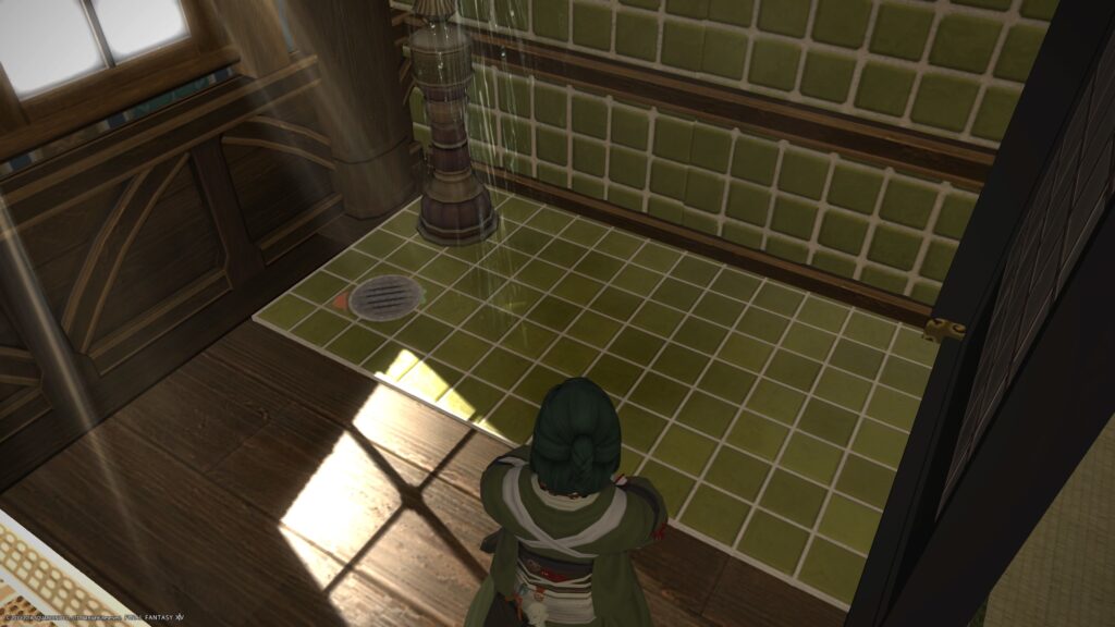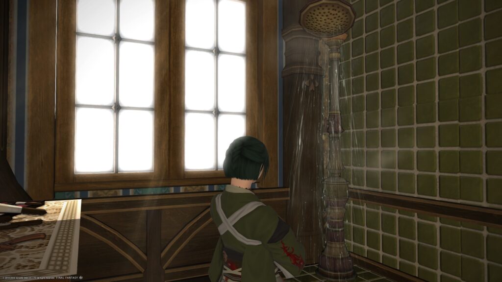 そうそう、それでね。今回、感動したのが、このシャワーによる変化。濡れたところと乾いたところの描写がはっきり描かれてて、そこに感動しました。リアルでは当たり前なんだけどさ、エオルゼアでも描かれるとは思わなかったです。ハウジングしていると、フツーに過ごしてたら気づきにくい部分もこだわりに触れられる瞬間が増えて、それがなかなかに面白い。