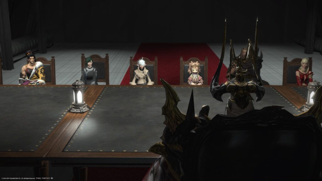 や、冒険者はエオルゼアの英雄と呼ばれてるね。招かれたね。だけれども、ここ、中央に近過ぎない?? 冒険者は冒険者なんだよ〜。なんで一国を代表する、アイメリクさんやヒエンさまをさしおいて、たとえ英雄と呼ばれていても一介の冒険者が、こんな席に座ってるのよう〜。これじゃこっそり、飴ちゃん舐めたりもできないじゃない。