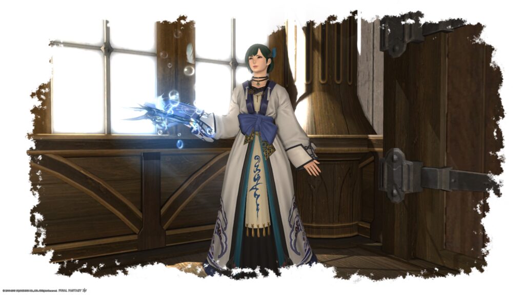 お気に入りデザインの首飾りをミラプリしましたが、ううん、ちょっと悩ましいですね。むしろ首飾りがないほうがスッキリするかしら? 頭装備もあれこれ考えましたが、も、シンプルに青系の髪飾りにしました。和風にしてみようと思ったから脚装備もこちらにしたんですけれど。