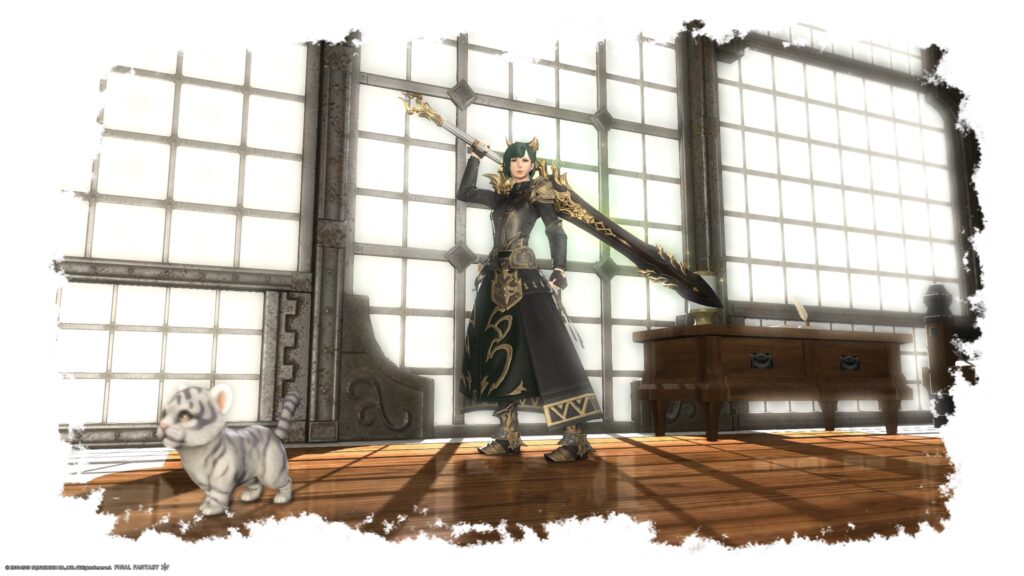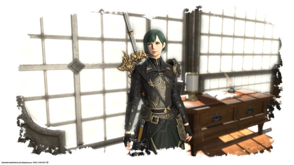 脚装備はほとんど隠れてしまいますけれど、足装備はわずかに見えます。ですから、その足装備にナイトスチール・ディフェンダーサバトンをミラプリしました。脚装備をいつものLV式長袴にしてますから、足も同じLV式にしようかと思ったのですけれど、ここのところの定番だから、という理由で他のものに変えたのですね。