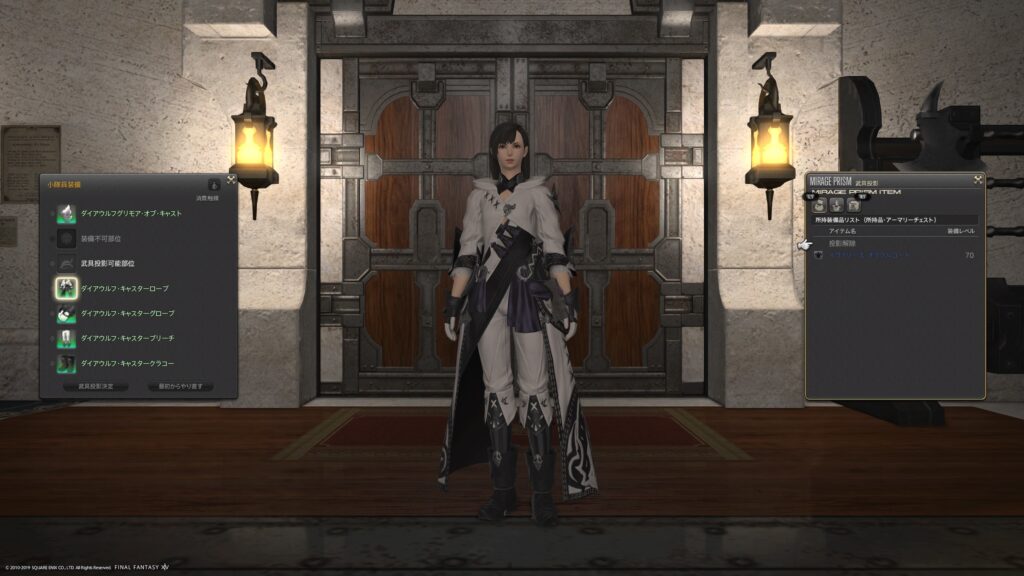 冒険者小隊へのミラプリは、アーマリーチェストに入っている装備やドレッサー、それから愛蔵品チェストに入っている装備が対象なのですね。触媒が必要なのではないかな、とも考えていたのですけれど、不要でした。だからそのまま、愛用の装備品をどんどんミラプリしていけるところがとても嬉しかったです。