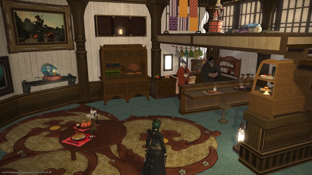 くつろぎたいから靴を脱いでもオッケーな感じにしたくて、オリエンタルテーブルを設置しています。冬だったらコタツを置いていましたねえ。でも今は春だから店売り敷物を置いて、の〜んびりごはんを食べられるスペースです。近くにバーカウンターもありますが、その付近にいるのは、素材屋さんとよろず屋さん。なのでごはんは出てきませんが、話し相手にはなってくれてそうな感じにしました。ここにも窓が2つありますね、換気扇代わりです。