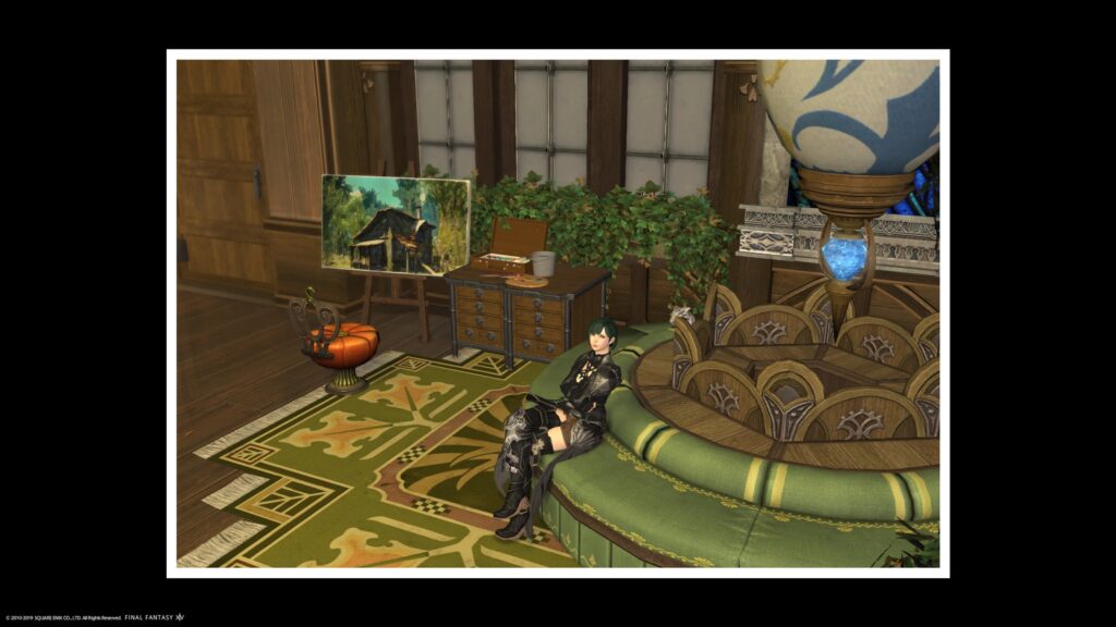 それからちょいと寂しい一角に、イーゼルなどを追加しました。絵はね、グリダニアの某親方のお家周辺です。これ、探検手帳を埋めていったら、たくさんのイラストが画家さんのところで1000ギルで買えるのよねえ……。探検手帳、再開しようかなあ。とおもいつつ、他の部分もいそいそ追加しました。