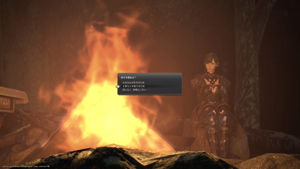 ズバリいうと、ここで冒険者は蒼天のあの旅の場面を思い出してるんだなあ、と思いました。あの時の記憶は本当に、冒険者の中では大きなものだったんだなあと実感しました。だからこそ、選択肢の答えは、全部選びたい気持ちがあります。
