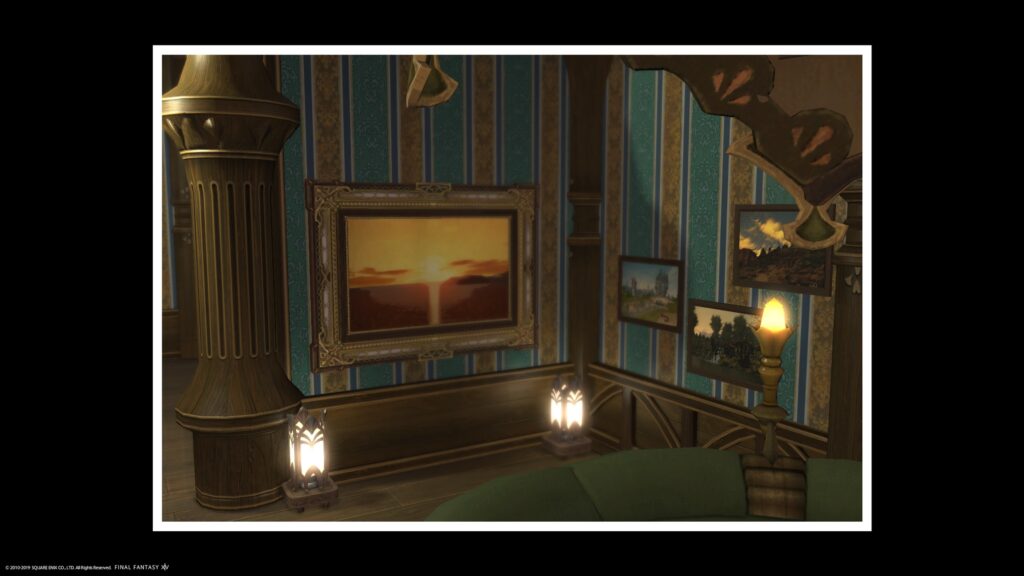 北西側はベッドが置いてあります。そして北と南を区切っているフリーパーティション(壁紙設置済)を眺めると、絵画が目に入ります。これは、ええと、シルバーバザーだったかなあ? 漆黒がくるしクリスタルタワーもいいなあと思ったけれど、購入できる絵画だとイラスト絵画だったんですよね。油絵が欲しかったから、あざやかな夕日が綺麗なこちらを選びました。やっぱり探検手帳を頑張るかな……。