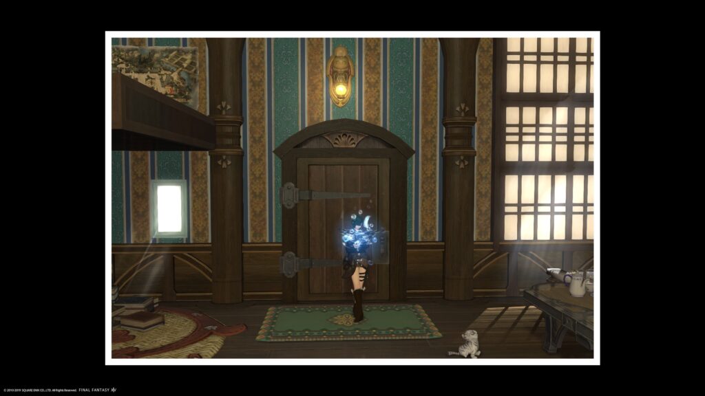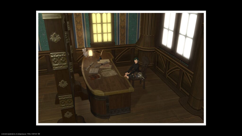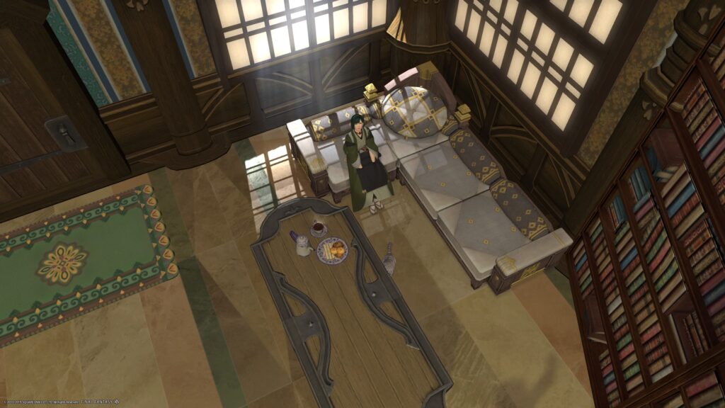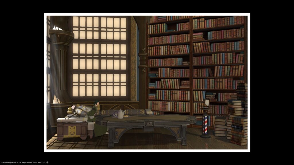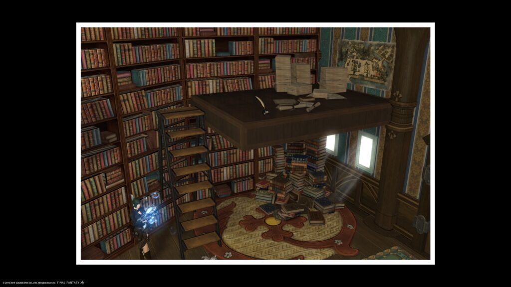 召喚といえば本。だから本棚がけっこうたくさんあるお部屋です。ロフトもありますが、その上には、散らばった書類があります。きっとね、ギミックをメモった紙が散らばってるのですよ。よくある状況ですね。山積みになっているのは、ジョブガイドとかその辺り??