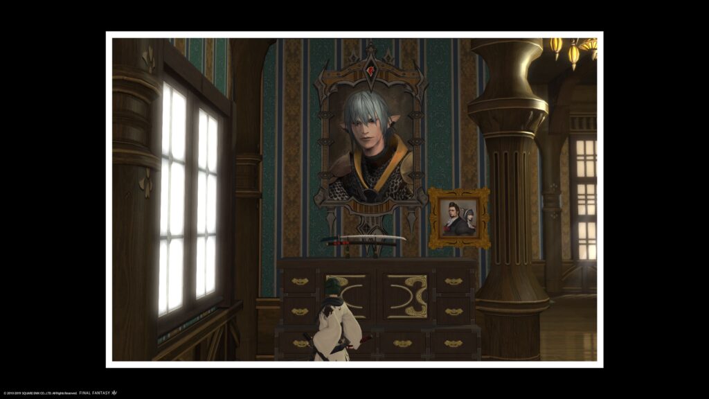 続きまして、北東側は、書斎ですね。ロイヤルパーティションを置いています。フリーパーティションなど考えたんですが、部屋全体が狭くなるんですよね。だから書斎に、視界を遮るから集中できるみたいな感じで、ロイヤルを置いてみた。書斎からは盟友の肖像画を置いています。事件屋さんの肖像画も。おいら、侍も頑張ってるぜ、ということで刀を置いてみたり。