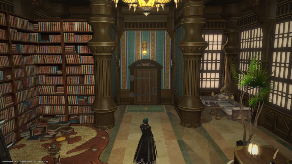 個室の名前を図書室にしているから、やっぱり本がたくさん置いていないと。というわけで、本棚を三つ並べています。フリーパーティションで小部屋をいくつか作ってますね。出入り口付近にある小部屋は、完全なくつろぎスペースにしてますね。本棚の裏のスペースには、オーケストリオンを置いています。プレイリストでFF15の曲を組んでいるから、それを順番に流しているのですよ。あの曲、大好きなのです〜。