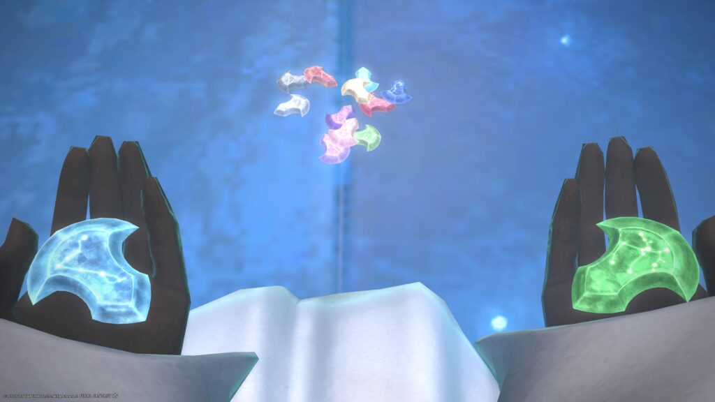 ヒュトロダエウスが冒険者に集めさせた星を渡せたとき、わたしはこだわりなくほっとしました。エリディブスが子供であったとか、そういうことはあまり響きませんでした。それより、エリディブスが彼のまことを取り戻せたこと、それが本当によかったなあ、と感じたんです。ゾディアークからこぼれ落ちてでも仲間を助けに向かった彼、でももしかしたら、仲間の側では、軽い隔意はあったのかもしれない、と想像しながら。エメトセルクが消えた時点で、本当の意味ではオリジナルは全員消えていたんだ、彼らの本願はもう終わっていたんだ、とも考えながら、目の前で仲間への哀惜を表しているエリディブスに切ない気持ちを抱いたのでした。