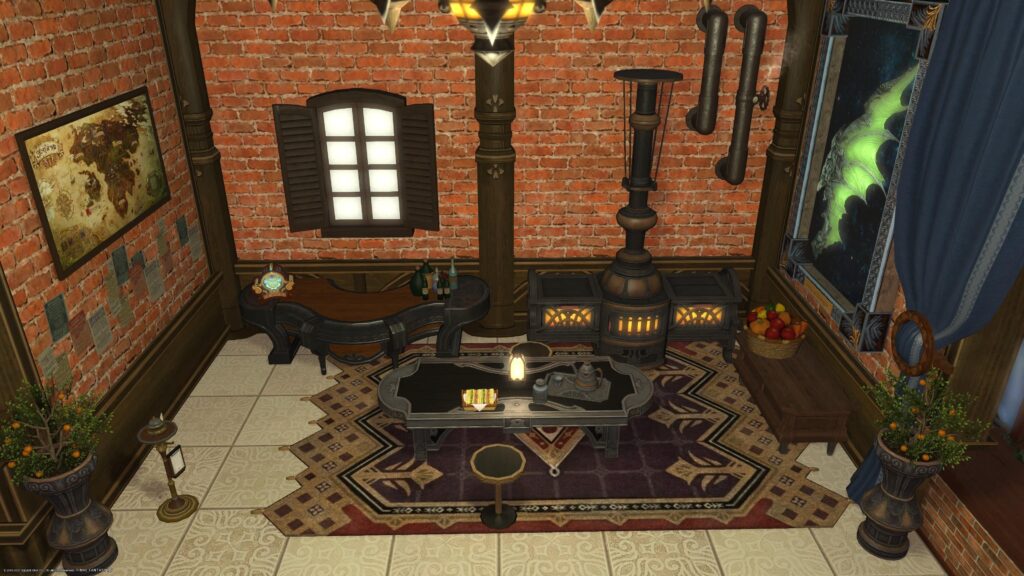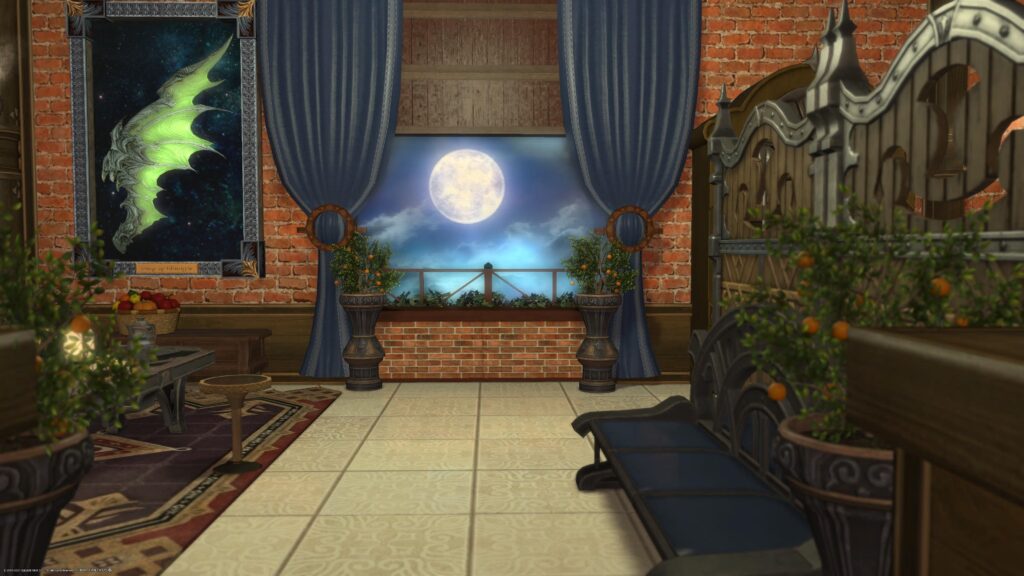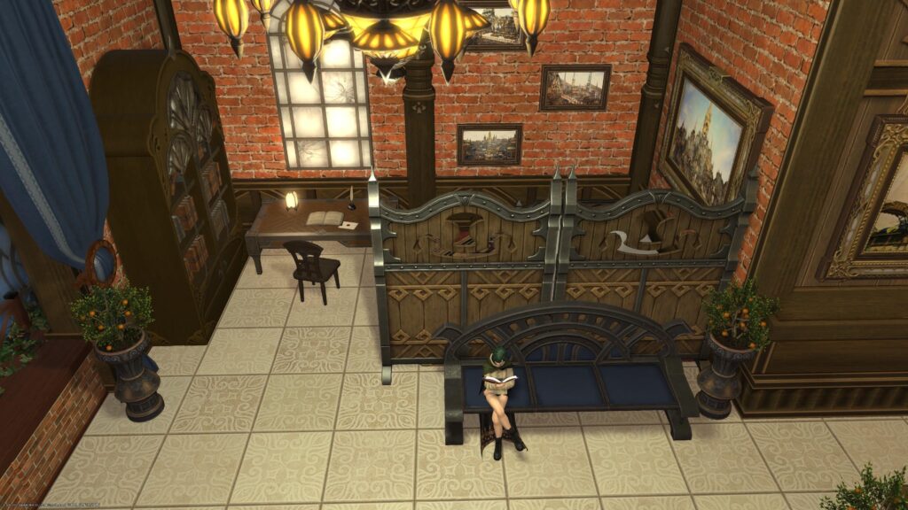ここはもう、再現できないところだらけです。愛好の紀行録は椅子に腰掛けるタイプだし、ミラージュドレッサーはハウジングアイテムに実装されてないし。だから開き直ってオリジナルの部屋っぽくなっています。