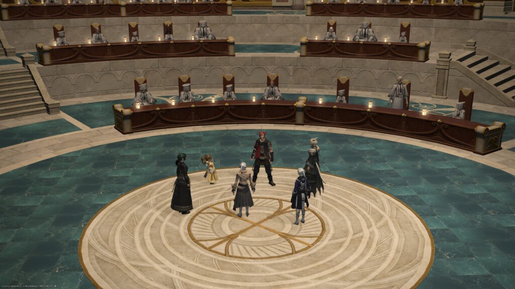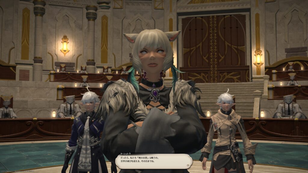 で、グ・ラハが禁書を調べていたところを見つかったこともあって、暁メンバーは査問にかけられることになったのです。結果によってはエオルゼアに送り返されることになるとか? いや、それはないよ、そうしたらゲームが終わっちゃうじゃない、と、なかなかメタなことを考えてましたね〜。余裕こいてすまんこってです。