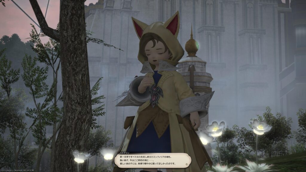 でもハイデリンがちゃんとミンフィリアを、原初世界の星海に迎えてくれたんだと知って安心しました。うん、そうしてくれて、わたしも嬉しい。ミンフィリアが納得してああいう結末を迎えたことは知っているけれど、それでも異郷の第一世界に消えたのだと思えば哀しい気持ちになってたから。……原初世界の星海でも哀しいことは哀しいんですけれどね、もうあの子は生きていないんだなあと感じたときは、とても切ない気持ちになります。