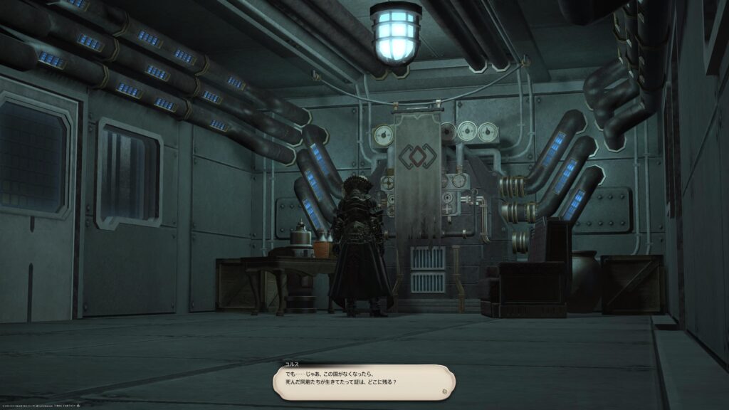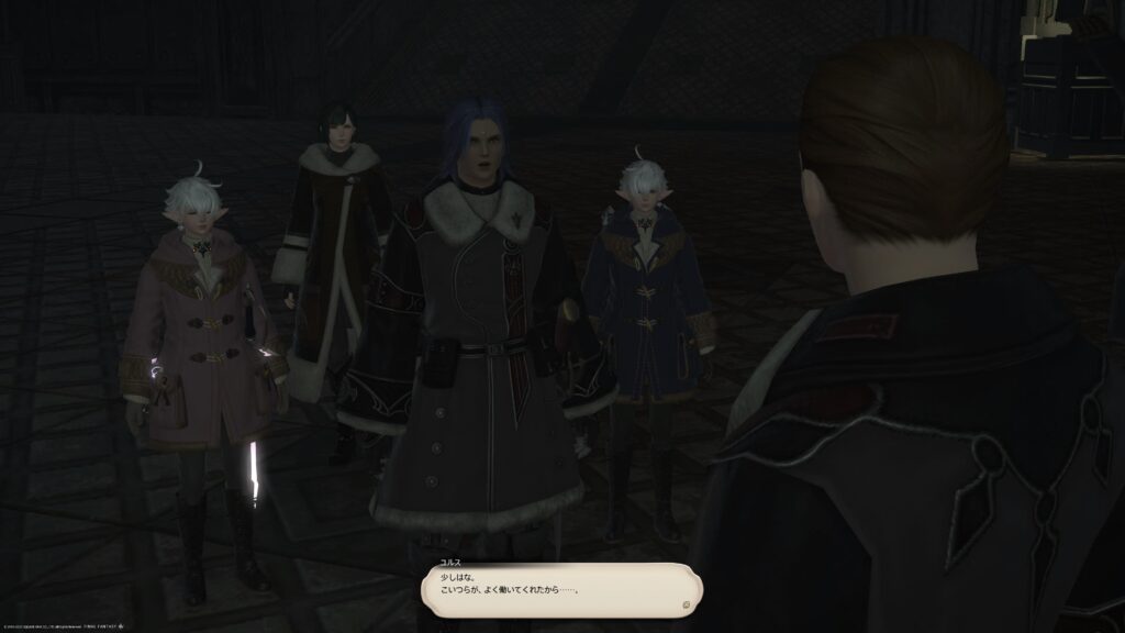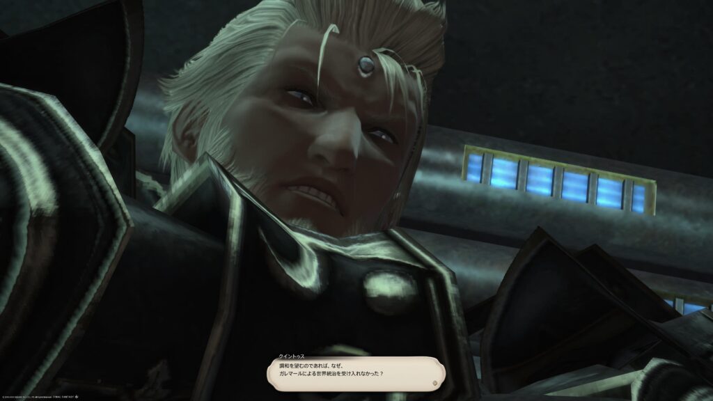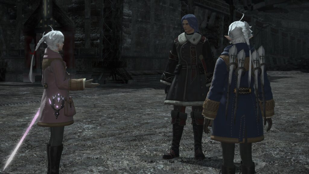 いきなり皮肉をぶっ放してきます。アルフィノとアリゼーが会話を続けようと努力しているんだけど、この人にはどうも、こちらと会話する気はないんじゃないかな、と感じました。話をさせてもらうとしよう、と確かに言っていたけれど、友好的な関係を築くための会話は成立しそうにないな、と、わたしには思えました。なにか膿んだような、頑なな印象が強くて、だからこの人との会話に挫けない双子たちに、あっぱれという気持ちになりましたねえ。わたしならもっと無礼な言動をして、なにもかも台無しにしてたと思うなー。