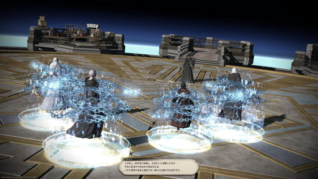 転身したヘルメスを押さえ込んだ冒険者たち。メーティオンとヘルメスはアーモロートに来てもらうとエメさんが告げたあと、ヘルメスがメーティオンに訊ねました。彼方の星に幸せは、命の意味はあったのだろうか、と。