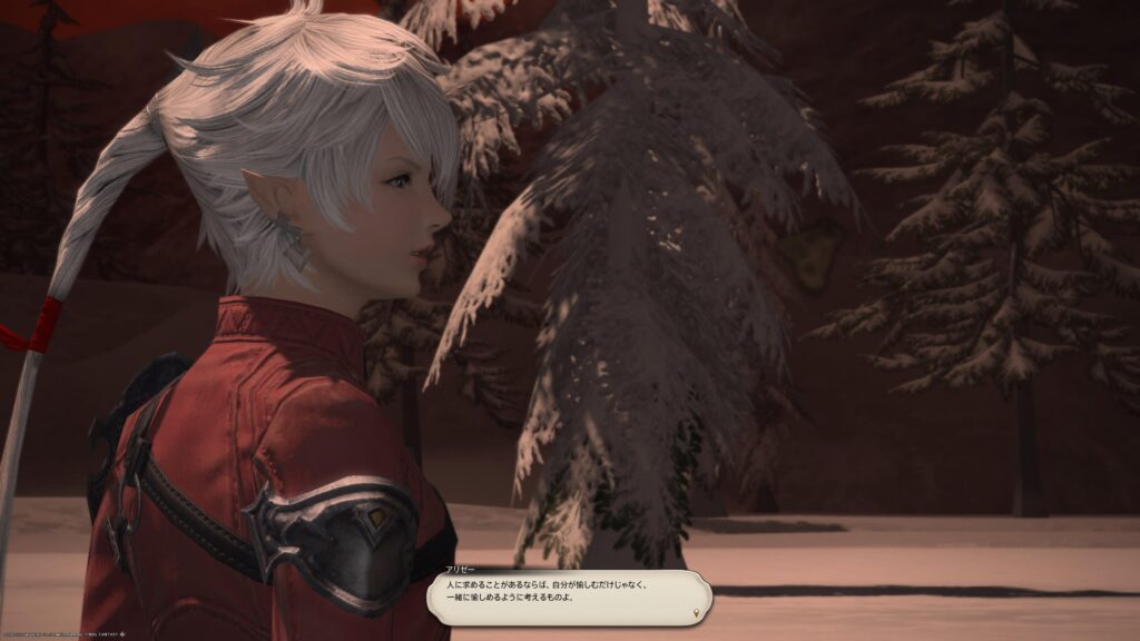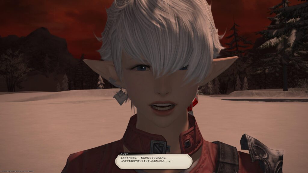ところでわたしは、アリゼーと冒険者の関係が描かれている一連のクエスト、バハムートシリーズをクリアしているのですよ。だからなのか、初回からこういうセリフでした。「エオルゼアの剣に、わたしの剣に〜」はバハムートシリーズをクリアしているからこそのセリフなんですよね。当時、クリアに誘ってくれたフレンドさん、ありがとうございます。