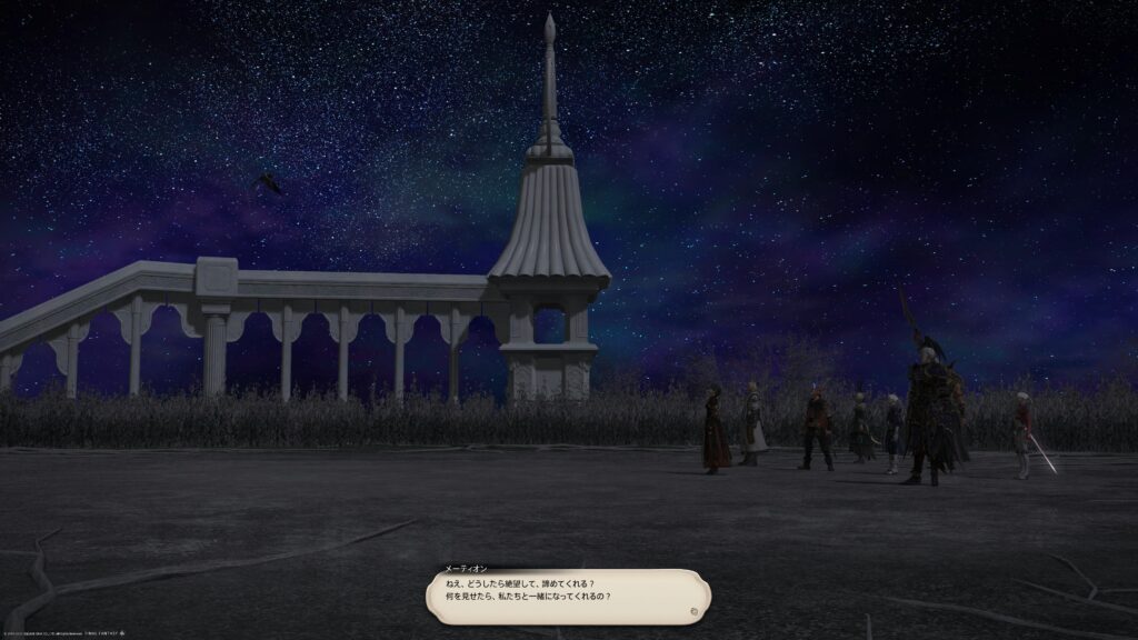 メーティオンの言葉に対して、戦って負けることと、あなたが信じるしあわせが正しいかどうかは、別の問題じゃないかなあと軽く首を傾げつつも、どこともわからない空間に、冒険者とゼノスは降り立ちます。冒険者は駆けて、メーティオンの元に向かいます。