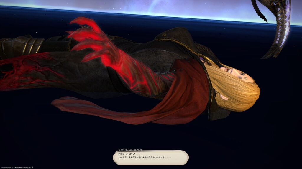 宙に飛ばされながらも冒険者を振り返ったアリゼーは「だめ!」と言います。が、冒険者はご覧のとおり、きれいな笑顔を浮かべて、この転送装置のボタンを押してしまうのでした。ラグナロクに転送されてしまう暁の仲間たち。冒険者はというと、転送装置から手を離したから、転送されません。一人、終焉を謳うものの前に残ることになるのです。