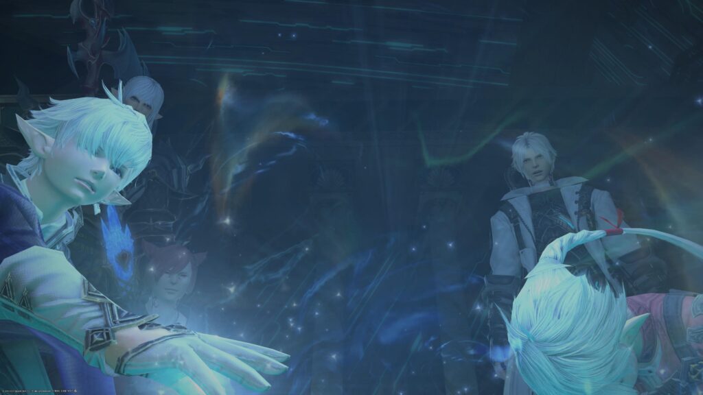 このとき、暁の仲間たちはさぞ慌てふためいたんだろうなあ。気を失っている冒険者のまわりで声を荒げてるみんなの声、聞こえますものね。細かなところまで聞き取れなかったけど、平然としていることが多い成人組も動揺していることは伝わってきました。ひときわ強く嘆いている声は、アリゼーの声。その言葉に、たしかにあの場面が別れだと辛いよねえ、と思っていると、冒険者、目を開けました。