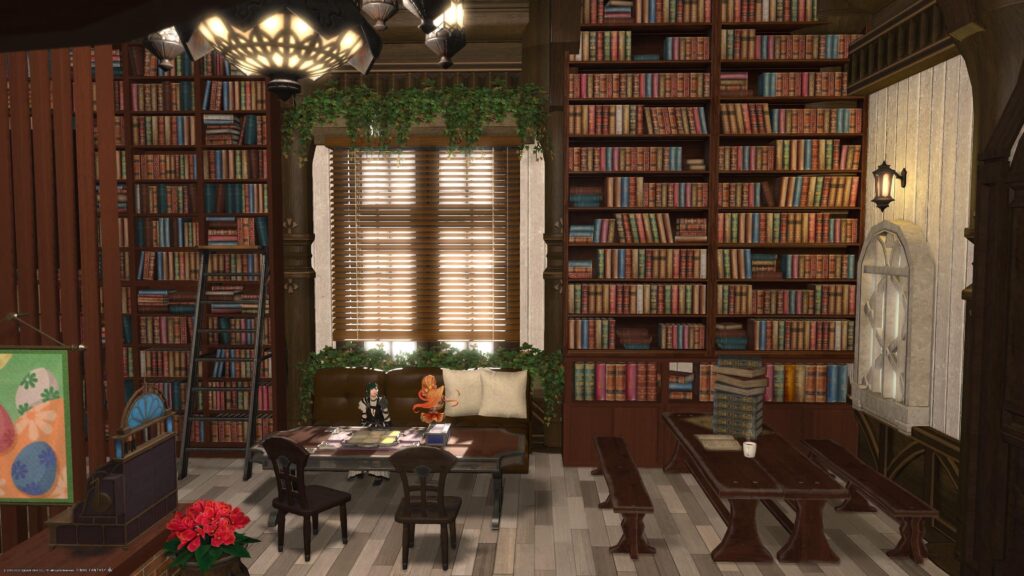 ここはその名の通り、ブックカフェらしいスペースになってくれたかな。読みかけの書物や占星院の星図を置いてそれっぽくしています。また、ちょっと離れたところではトリプルトライアドボードを設置しているから、カードで遊ぶこともできる、という感じにしました。