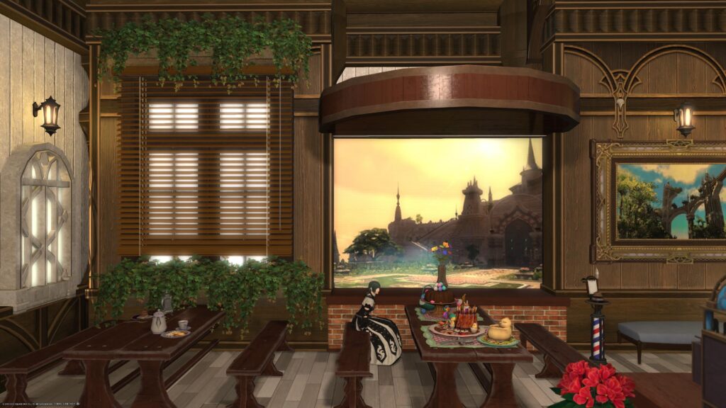 こちらはよりカフェっぽいスペースですね。新しく追加されたマジックランドスケープ:空中庭園を中心に設置して、左右にはシュラウド・パーティションを設置しています。このパーティションには窓を設置することはできないんですが、そこは浮かせを使って設置しました。奥の絵画はエルピスの「風景画:メタバシス六洋院」です。