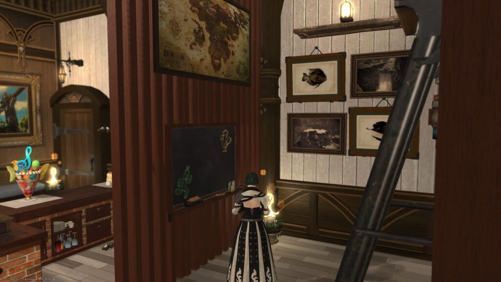 あと、使いたかったから、ウッドスラット・パーティションに、スモール・チョークボードとエオルゼア全図を貼り付けています。やー、スモール・チョークボード、使ってみたかったんですよね。おまけに店売りとは嬉しい限りです。あと、ウッドスラット・パーティションに壁掛けアイテムを設置できるんだなあと知り、驚きました。