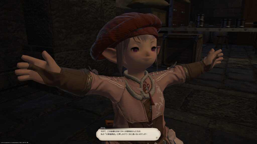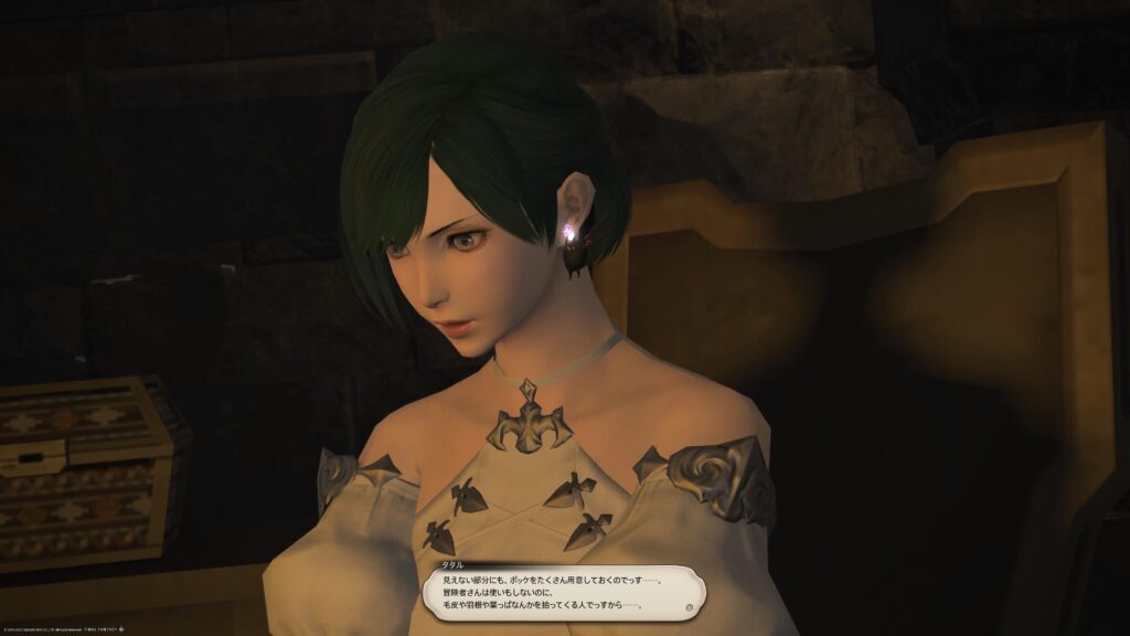 だから今、タタルさんに会うのはビミョーに気まずい。や、気に入ってないわけじゃないのよ。まだカンストしてない吟遊詩人や機工士の装備品にミラプリしてる。ただ、滅多にそのジョブに着替えることがないってだけでー。