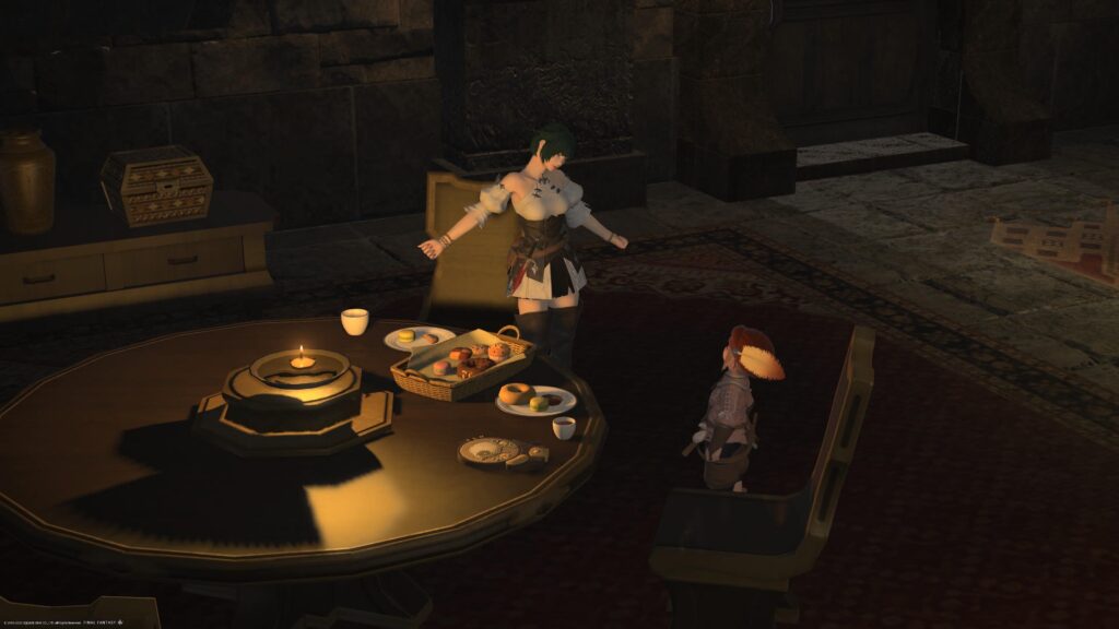 これらのお菓子はタタルさんのお手製なのかな? ともかくお茶を飲みながら、近況を話してくれるタタルさん。暁メンバーもみんな、それぞれに忙しく過ごしているようだと教えてもらい、タタルさんもやりたいことがてんこ盛りだそうですよ。うん、タタルさんのお手伝いができるようになる(確定)日が楽しみです♪